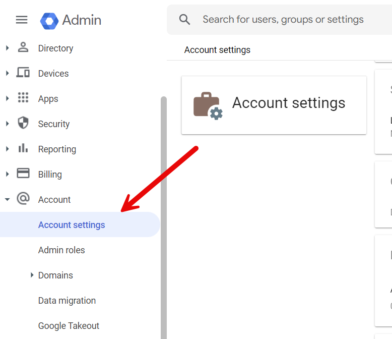 - Using your Google Workspace account, go to Account Settings under Google Admin