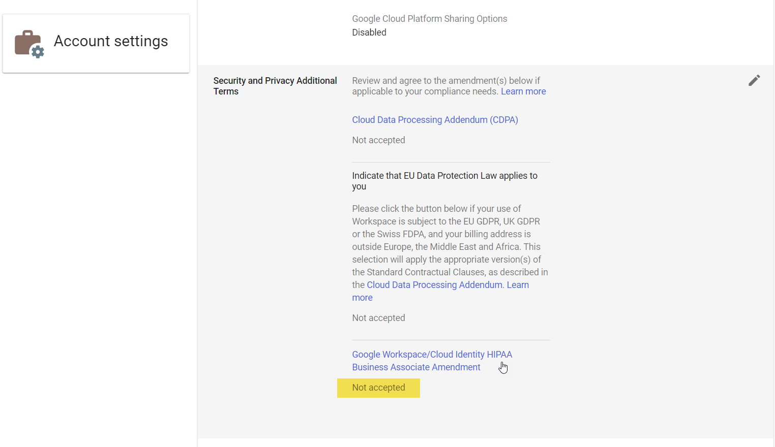 - You will see a subsection for “Google Workspace/Cloud Identity HIPAA Business Associate Agreement.” If you haven’t accepted it yet, it will show as “Not accepted.”